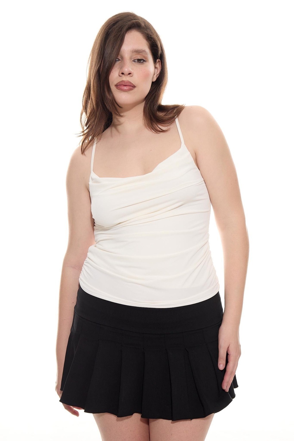 Top con pliegues escote corte recto con caída, forrado y con tiras regulables. Escote recto o escote buche según regulado de tiras. Microfibra liviana con spandex.